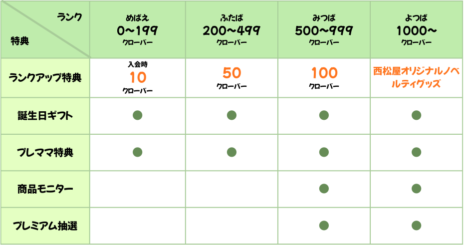 お買い物でクローバーを貯めてランクアップすると特典が増える!